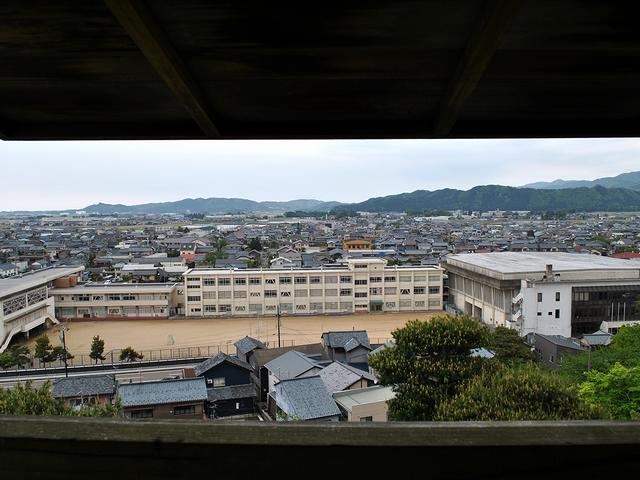 補助用の縄がぶら下がっている急な階段で天守最上階まで。それにしても、天守がコンパクト故中はかなりの人口密度でした。で、写真はその最上段からの景色なのですが、この北方向、現在坂井市立平章小学校が建っているあたりはかつて二の丸だったところ。ちなみに、この平章小学校自体も、元々は文化元年(1804年)にお城の三の丸に建てられた藩校である平章館という由緒正しき学校だそうで。