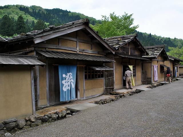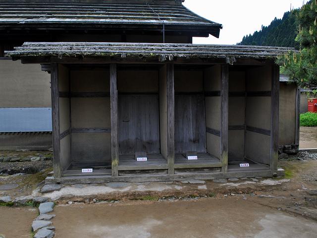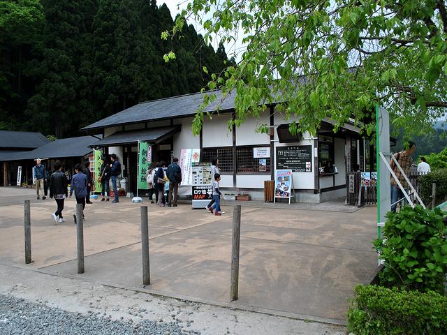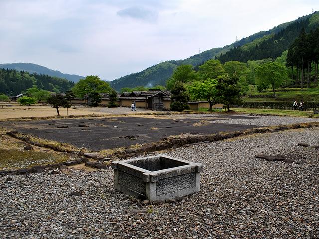 そしていよいよ、遺跡へと歩を進めるのですが、何カ所かある駐車場のうち、一乗谷を流れる一乗谷川の左岸(上流から下流に向かって眺めたとき左側の岸)側、復元町並みを通り過ぎてすぐの所にある駐車場に。空きスペースには多少余裕があったものの、観光バスを含め結構な台数のクルマで賑わっておりました。そして入口で日本100名城スタンプラリーのスタンプを貰い、先ほど購入した共通入場券でこの遺跡の目玉のひとつである復元町並の中へ。