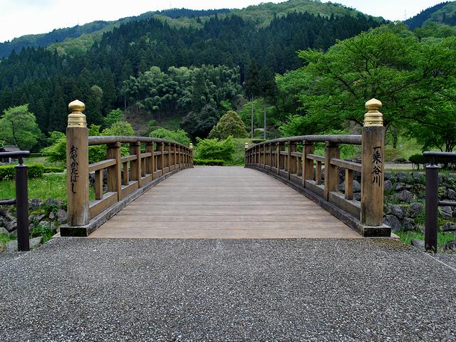 一乗谷川左岸側の復元町並を堪能した後は、その名も「おやかた橋」で川を渡って右岸側へ。