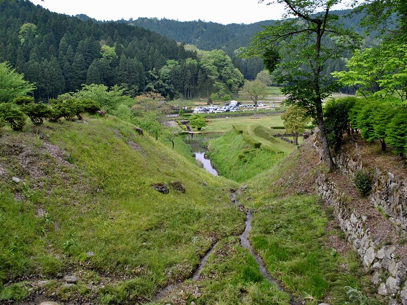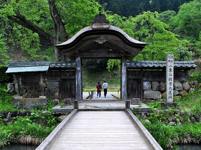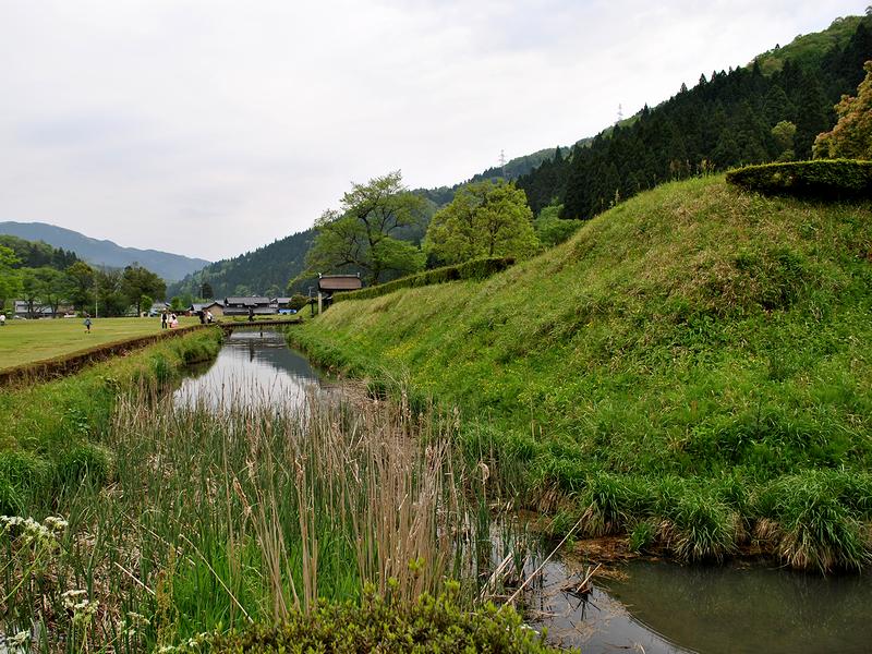 右岸側も見所満載なのですが、まずは、立派な土塁と水堀に囲まれた朝倉氏館跡へ。かつての正門の位置に置かれた唐門は朝倉氏の遺構ではなく、のちに建てられていた松雲院の寺門として朝倉義景の菩提を弔うために作られたとのことで、現存するものは江戸時代中期頃に再建されたものだそうで。それにしても、敷地の広さからかなりの規模だったことがわかりますね。
