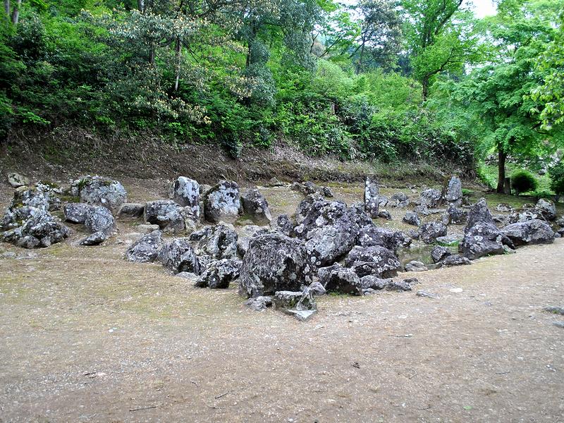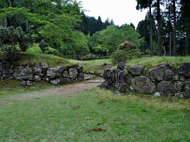 朝倉氏館跡の上部にあるのが、国の特別名勝に指定されている湯殿跡庭園。16世紀初の、朝倉孝景の時代に造られたと考えられており、現在は石組みだけが残っていますが、当時は中の池に水をたたえた回遊式の庭園だったそうで。