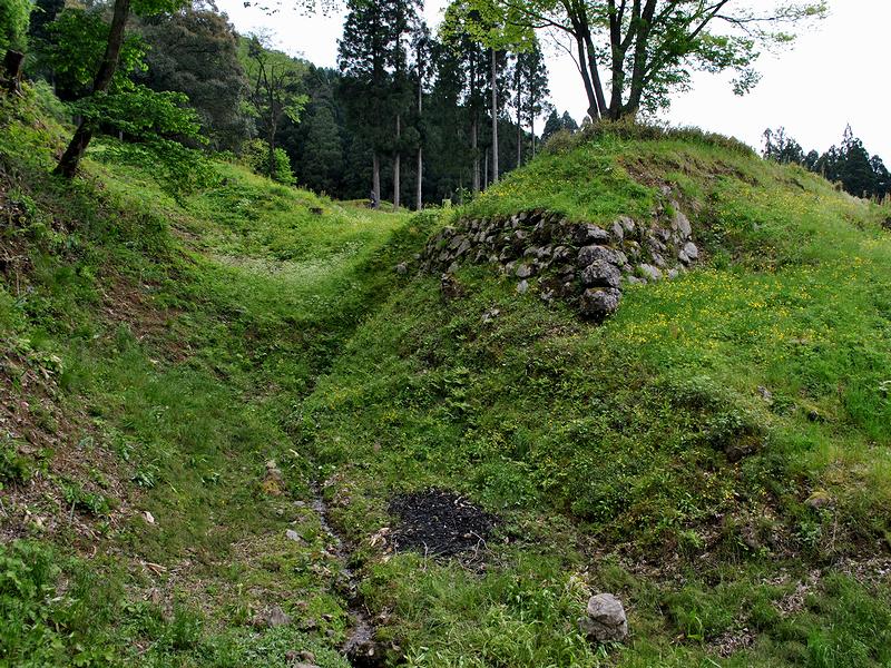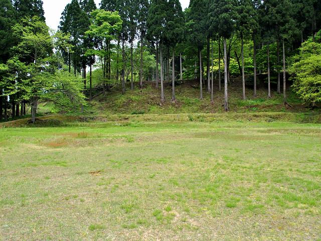 湯殿跡庭園とお隣の中の御殿跡の間には、堀が刻まれていました。そして中の御殿跡は、朝倉義景の母である光徳院が居住したと伝えられている御殿跡。ここも朝倉氏館と同様に、まわりを土塁で囲まれていたそうで。で、そこを抜けると当時の道路跡や、山肌を削った意味ありげな段差などが。