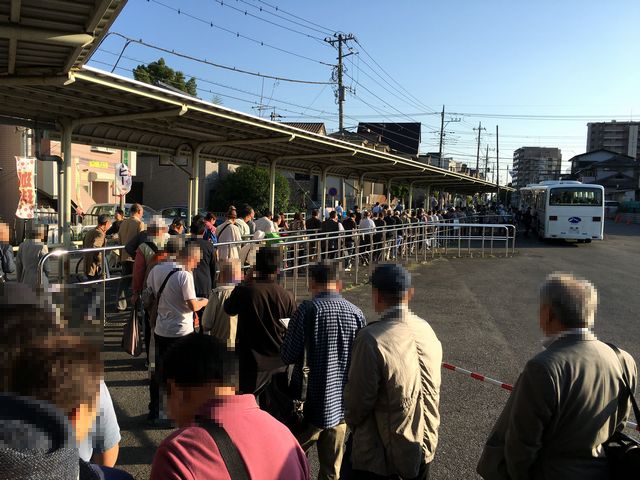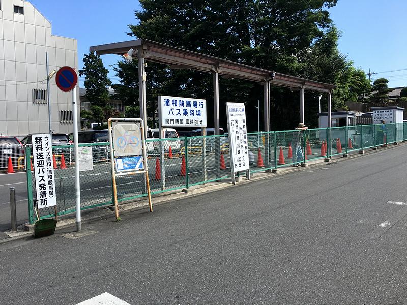 南浦和駅には午前9時をちょっと回った頃に到着。事前に調べたとおり東口を出ると、まだ時間が早いのかそれっぽい人が見当たらずに焦ったのですが、よく見ると横断歩道の向かい側植え込みの中に送迎バスの案内看板を発見。それに従い左手方向(北方向)にちょっと歩くと無料送迎バス乗り場がありました。