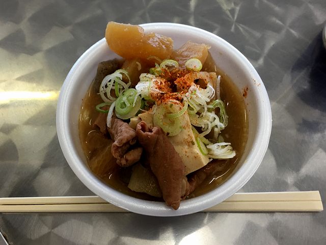 それでいただいたのが、定番のもつ煮。そのお味は、味噌の風味が強く甘味控えめ味濃いめという、ある意味男らしいもの。個人的には好きな味ですね。またモツは豚モツで、他に入る大根、こんにゃくはどれも味が染み染み。また、後入れの木綿豆腐のプレーンな味わいが、全体的に濃い味の中、何ともほっとさせますね。