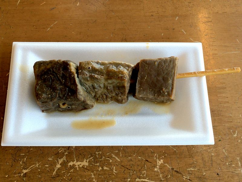 南関名物の牛ホルモン煮ですが、浦和にもありました。フワ(フク)を串に刺して味噌味で煮たお馴染みの物ですが、今回のはいただいた時間が早かったせいか、食感がフワプリなかわりに、例のちょっとクセのある味がわりと全開で、焼酎や昔で言う二級酒の類いが欲しくなるというか。