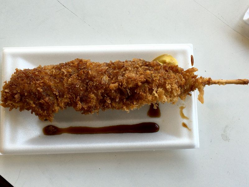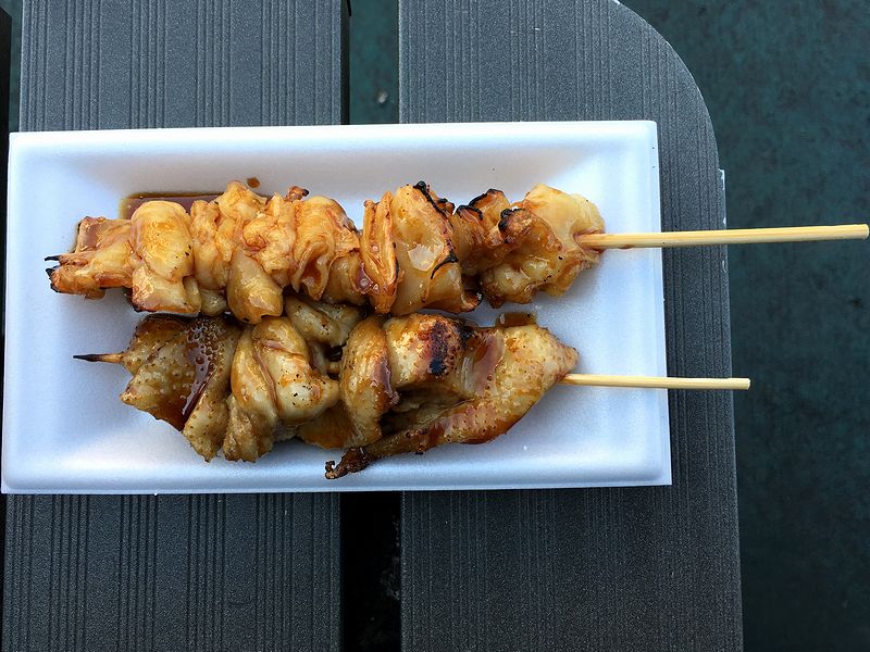 お次は定番の焼き鳥を。ちなみに、優駿グループ5店舗のうち、焼き台を備えて焼き鳥売っていたのは4店舗だったかと。で、今回は自分的にはあまりいただいたことがない2品をチョイスしたのですが、鳥ハラミは、皮がメインでそこに身が少々という感じ。そして鳥モツは、外側のカリっと、中はモツらしいクニっとした食感。クセはそんなになく、むしろ酒が進む感じ。あと、こちらのお店のタレは、ちょっと甘めなのが特徴的でした。