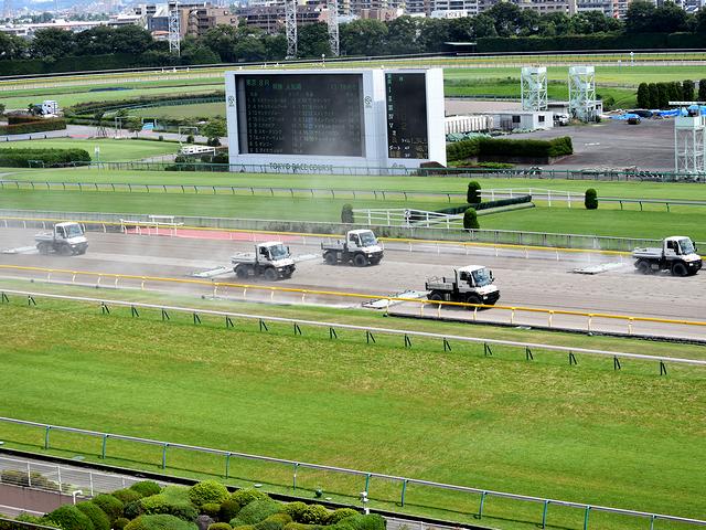 広い東京競馬場のダートコースを、楔形陣形でハロー掛けするウニモグ。