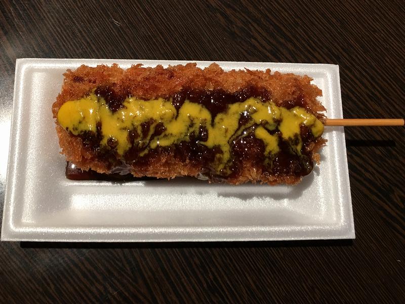 それでいただいたのが、何故かこちらの串カツ。東京式の豚肉とタマネギが交互に刺さっているタイプです。で、タイミングの関係で揚げ置きだったせいか豚肉が若干固くなっていたのですが、衣はまだサクカリ感があり悪くないかと。