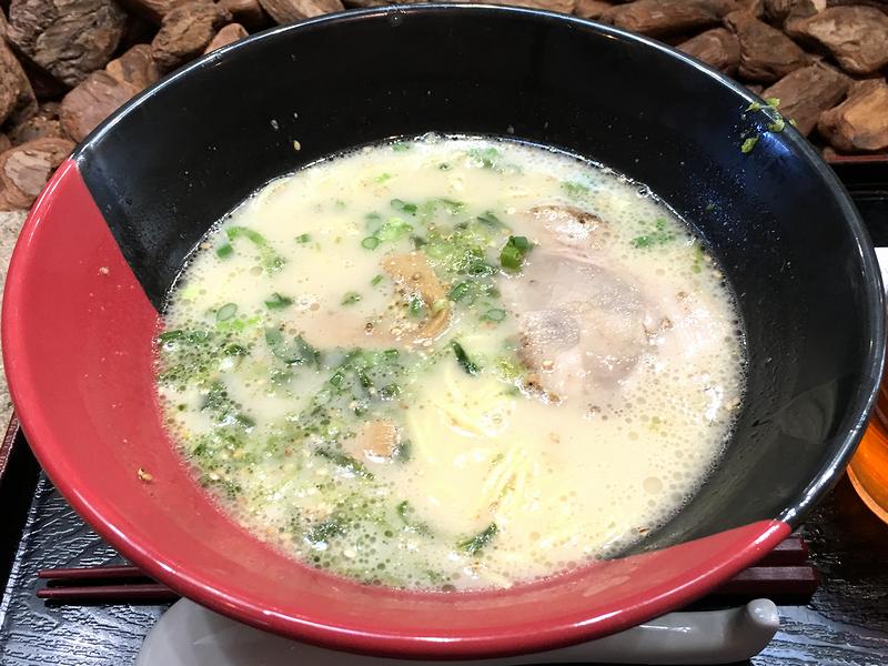 それでいただいたのが、店名を冠していますが一番お安いラーメンであるこちらの品。実は今回競馬場で散々飲んだ最後にシメでいただいたものだったりします。で、スープは「飛び魚(あご)だしととんこつのWスープ」を謳ってますが、サラっとした口当たりに、豚骨がクリーミーでまろやかな印象。そしてそこにアゴ(トビウオ)が個性を加えています。また麺は、細めのストレートタイプで、シコシコ感強めで、具は、チャーシューの他、長崎産のあおさが特徴的。それと、カウンター上に用意される薬味系は、コショウの他お酢にラー油、おろしニンニク、豆板醤、柚胡椒と豊富。今回は柚胡椒にしてみました(丼の縁に付けようとして失敗して汚くなってしまいました。)が、味が締まって良いですね。ですが、紅生姜を入れ忘れたのはちょっと勿体なかったなぁ、と。