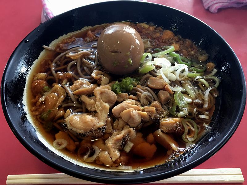 それで前回馬場内広場でいただいたのと同じ組み合わせをいただいたのですが、まずはつゆは、違うっちゃ違う気がするも、控えめなダシ感や良い按配の味付けなど、味的には前回と同じような印象も受けました。ですがソバは、この記事を書くにあたって前回撮った写真を見直して判ったのですが、明らかに色が黒っぽいです。もっとも、味的にはどう違うか正直判らなかったのですが…。そして具の鶏肉と追加の味玉は、どちらも味が染み染み。それと、こちらにもあった柚胡椒との相性は抜群ですね。そんなわけで、連食すれば違いがわかったのでしょうが、正直モヤっとした結果になってしまったのですが、「両方とも美味しい」で良い気もします。
