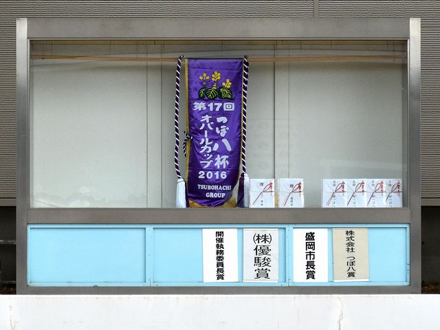 盛岡競馬場のパドックですが、正面向かって奥に、本日行われる重賞レースの優勝レイなどをかざすスペースがあるんですね。あと、今回パドック全景の写真が無いのは、ただ単に撮り忘れたからでして…。