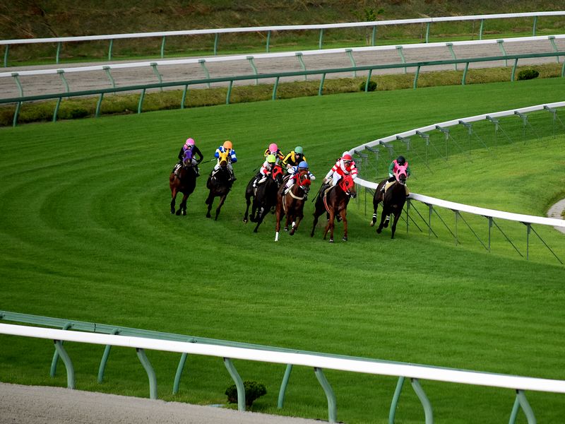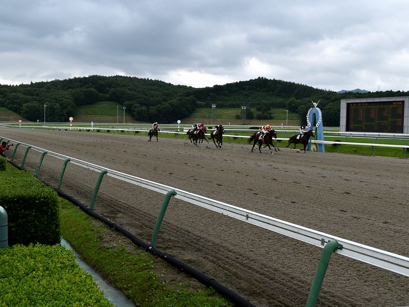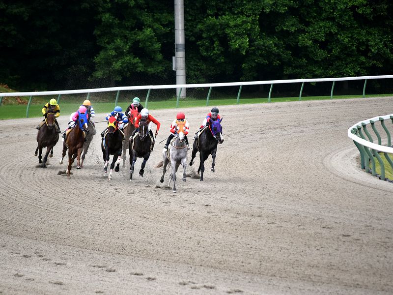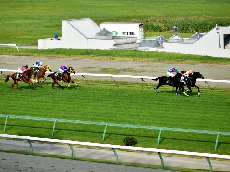 地方競馬最大級の1周1600mのダートコースは幅員25mと広め。また最後の直線が300mと長いのに加えて最終コーナーからゴールまでに約1.5mの坂がある(ちなみに全体の高低差は4.4m)ため、先行しても力がなくては粘れないタフなコースです。それにしても、最終コーナーを回る時って、かなり内を空けるんですね。