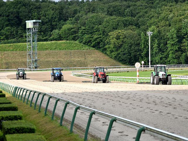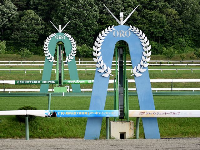 地方競馬場で唯一ここだけの芝コース。1周1400m、幅員25m、最後の直線は300m。また高低差は4.6mですが、最終コーナーからゴールにかけての坂はダートコース以上の約2.5mあり、ゴール前で順位が一変することもザラ。人気薄がちょいちょい激走します。あと、こちらのスターティングゲートはトラクターで牽引されていることからJRA式を使用しているようですね。