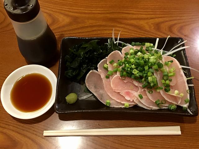 そしてつまみは、珍しく感じたこちらの品をまず。で、お品書きにはササミと胸肉の2種類があったのですが、ササミは品切れと言うことで胸肉をいただくことなったのですが、表面に火が通った鶏肉は、登場時半解凍状態。早速わさびを載せてネギと共にポン酢のようなタレを付けていただけば、これがまた。口に入れると最初は冷たさと共にシャリっとした食感を楽しめ、薄切りなので程なくして肉の味が楽しめます。これはお酒が進みますねぇ。あと、たっぷりあった付け合わせのワカメと白ネギも、箸休め的に合間にいただいたり、後述のラーメンに投入したりして楽しめました。