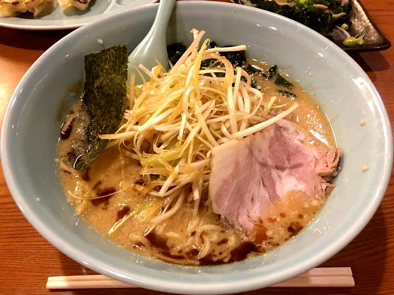 そして〆は何故か中盛りにしてしまったネギ味噌ラーメン。ネギに絡まったごま油の良い香りが何とも食欲をそそられますね。で、スープはどこかラーショっぽい豚骨がベースで、そこにたっぷり入る背脂がコッテリ感を付与。これに負けないくらい味噌ダレも強めに効かされていて、濃いめだけど飲んだ後には何とも心地良いバランスですね。そこにおろしニンニクを入れれば味がぐっと締まるのと同時に奥行きが出て、一口また一口とあと惹くというか。また、麺は若干やわ目の中細。ポニョッとした食感です。そしてチャーシューはホロ系だけと歯応えもあっていい感じ。あと、ワカメが意外とたっぷりと入っていたのですが、更に前述の鶏のたたきのネギとワカメも追加してきれいにいただいてしまいました。