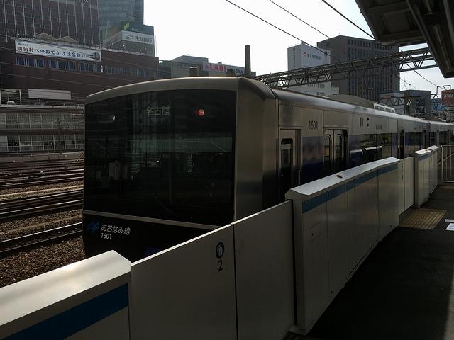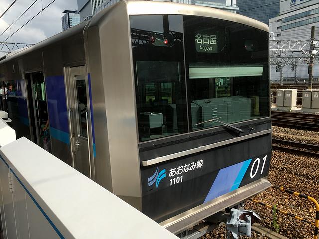 そんなわけで午前6時30分過ぎ、バスは名駅通り沿いにあるささしまライブ停留所に到着したのですが、その時とてもトイレに行きたい状態。で、駅のトイレを借りようと、さきしまライブ駅に向かったものの、これがちょっと失敗。地図を見るとここから名古屋駅に行くのもささしまライブ駅にいくのも大してかわらなかったりするのですが、小さい駅ならトイレも探しやすかろうとささしまライブ駅に向かったものの、駅付近を工事をしている関係でかなり迂回させられたというか。それでも何とか人としての尊厳を失わずに駅に到着。トイレは改札内だったので手持ちのSuicaで入場し、一息つきました。で、その後、丁度ホームに入ってきた列車に乗って名古屋駅へ。で、乗り込んだのは1000形といって、あおなみ線の全列車で使われている形式の車両なのですが、3扉ロングシートの通勤形で、そのロングシートが1人ごとに区切られていたのが面白いです。