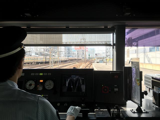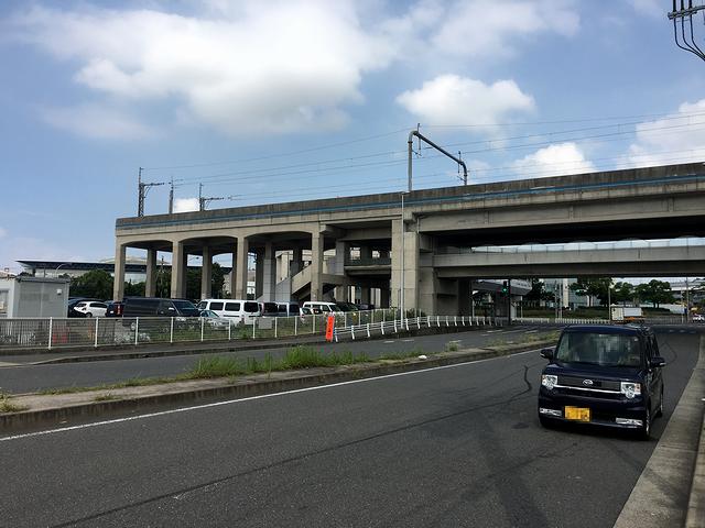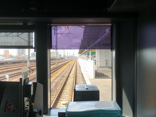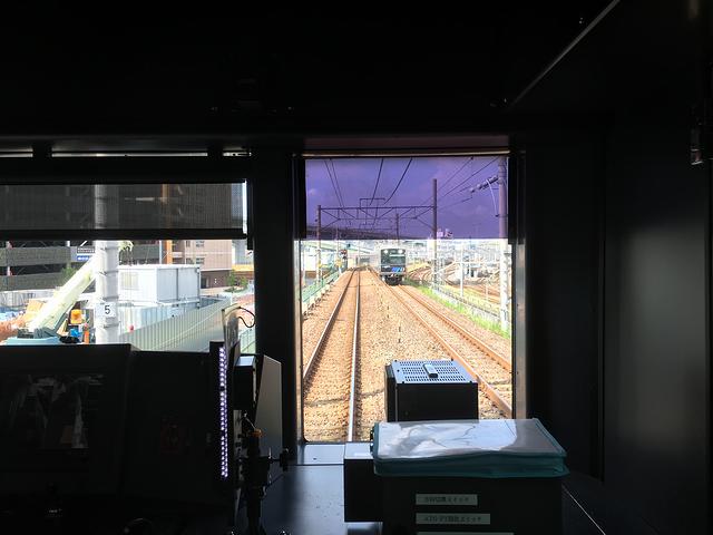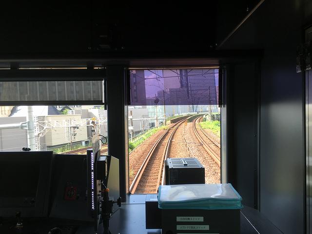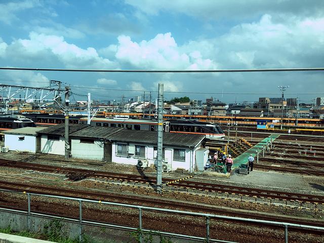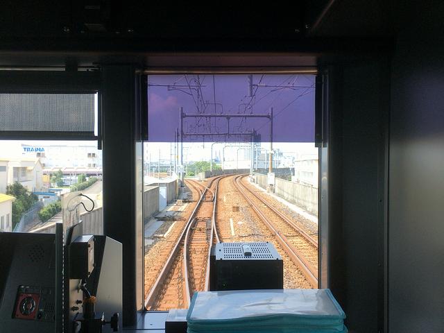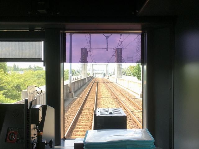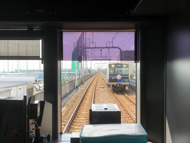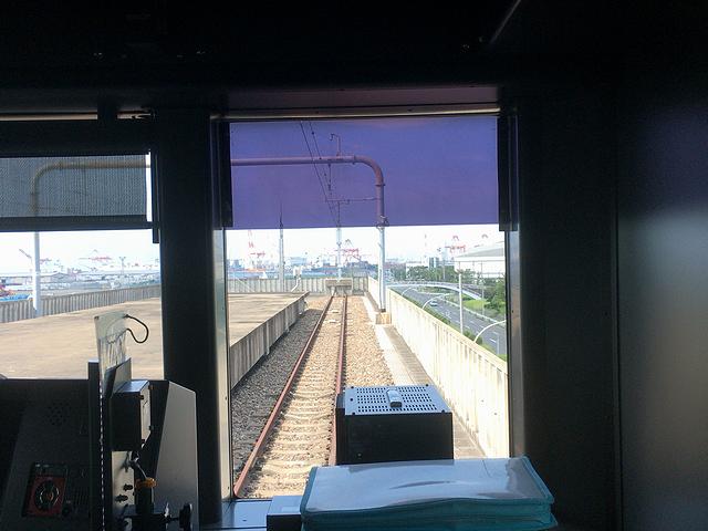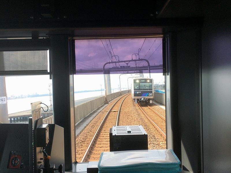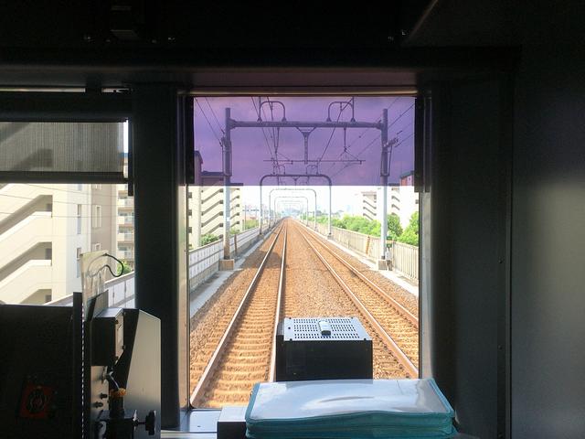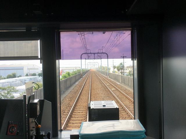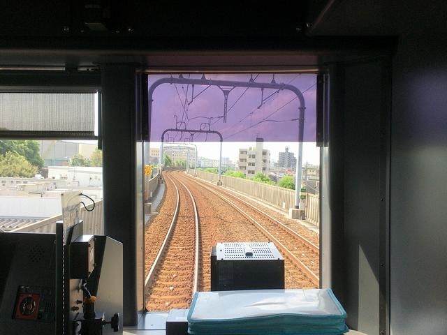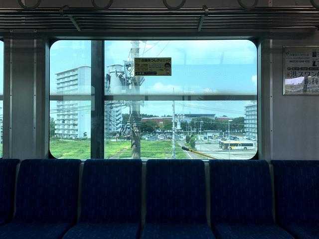 やがて定刻、列車は名古屋駅を発車。平日朝の下り列車ということで、ロングシートの車内は空席多数だったのですが、片道24分ということもあり、景色のよく見える運転席後ろに立つことに。(もっとも、少々恥ずかしいですけども。)で、すぐに右にカーブして先程乗ったささしまライブ駅へ。ここからは右手にJRの名古屋車両区と近鉄の米野車庫が広がり、ちょっとした見所に。JRはキハ85系特急形気動車などの気動車たち、そして遠くには近鉄のビスタカー(30000系電車)がちらっと見えました。そして今度は左手にJR東海名古屋工場を見つつ進み、それが終わって左にカーブを切ると小本駅。このあたり、アパート・マンションも見えますが、印象としては一戸建てが多い古い住宅地という印象です。