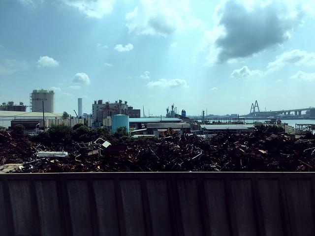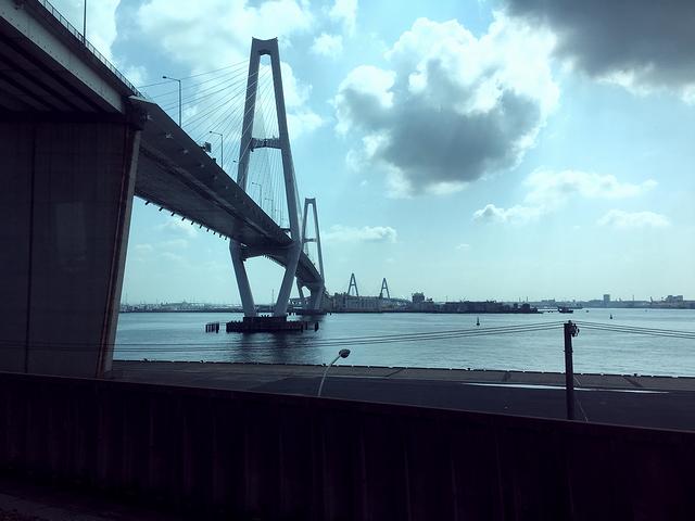野跡駅を発車すると、左手に見える工場は更に大きくなり、更には時折ジャンクヤードが混ざりだし、港が近いと感じさせてくれます。そんな中列車は、これまでよりも心なしかスピードを上げるように感じるのですが、このあたりからが沿線風景のハイライトという感し。前方に伊勢湾岸自動車道の名港トリトンが見え、そしてとうとう左手に海というか運河が現れると、09:14、定刻に終点の金城ふ頭駅に到着。