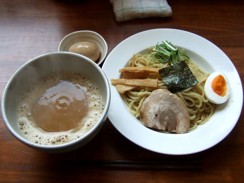 まず麺は、国産高級小麦100%、那須高原の天然水使用といういうことですが、噛むと結構な密度感が。そして付け汁は、ポタージュスープのような粒子感のあるもったりとした口当たりで、味わいは濃厚。無化調とのことですが、エキス分や脂が大量に溶け込んでいるように感じられ、旨味やパンチ力は十分過ぎる程に。ちなみに、東池袋大勝軒系とは言っても、一般的なそれ系の味とは全く別モノというか、共通するのは甘みと酸味を感じることくらいでしょうか。また追加の味玉は、割ってみると黄身がゼリー状。卵自体の味も濃いですが、それに負けない濃い目の味付けに感じました。で、麺を食べ尽くした後は、ポットに入れられたスープで付け汁を割っていただくのですが、その割りスープが、また。濃厚系付け汁の場合、割りスープはあっさりとしただし汁系の場合が多いと思うのですが、ここのは濃厚なスープを惜しげもなく、という感じで。ちなみに、セラミックのおかげで、冷たい麺のもりそばをいただいたにもかかわらず、最後まで付け汁は温かいままでした。