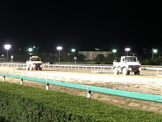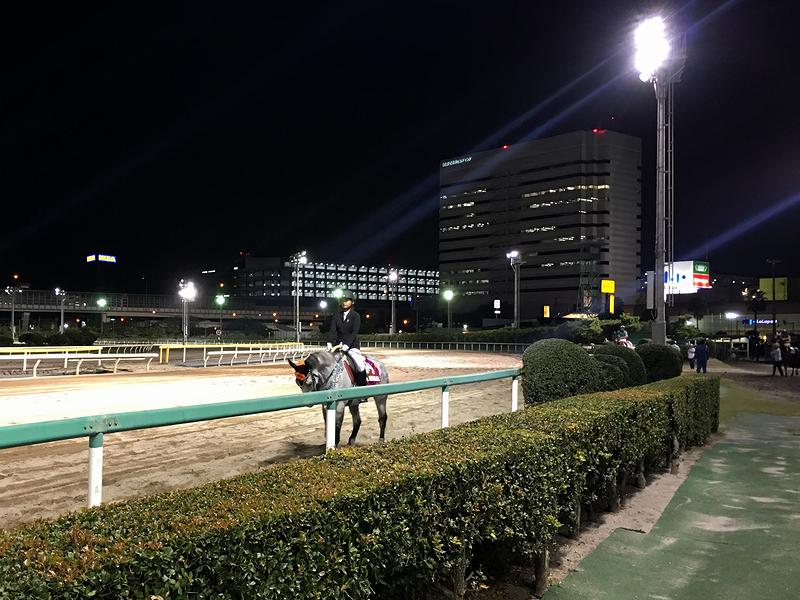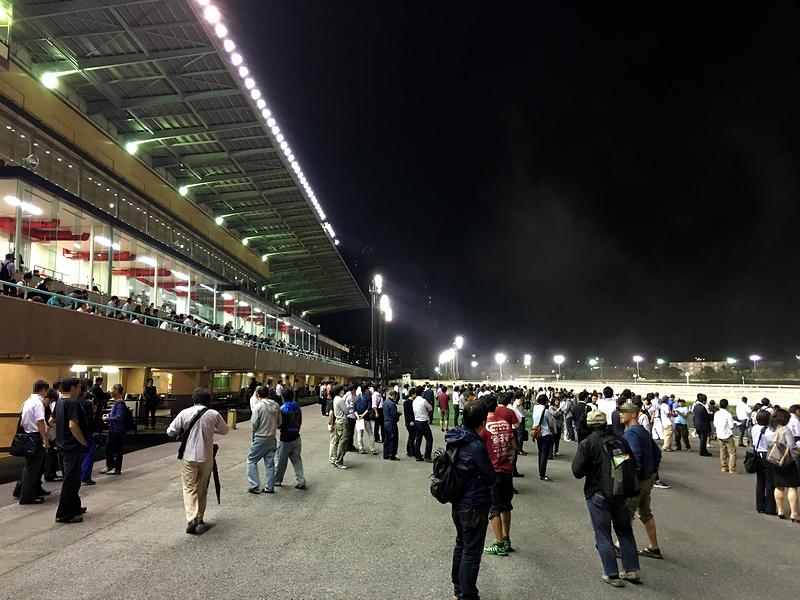 以前は中央が芝でしたが、ナイター開始時の改修に合わせてそうじゃなくなったパドック。それにしても、夜のパドックは殊更趣があるというか。