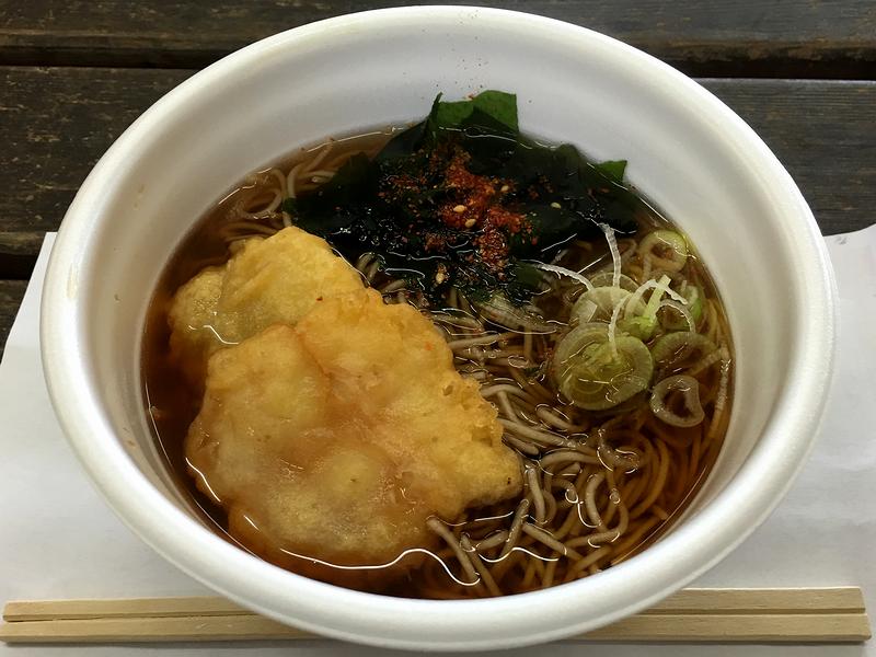 スタンド1階の第1コーナー寄りには、以前いただいたことがあるそばやうどんなどのお店があったのですが、今回約2年ぶりにお伺いしたところ、業者さんが入れ替わっていたようで。で、替わっていたからには、新しいお店がどんなものかいただきたくなってしまうのが人情というもの。ちなみに、こちらのお店はそばやうどんの他にも、串カツやメンチ、コロッケといった揚げ物も充実していました。
