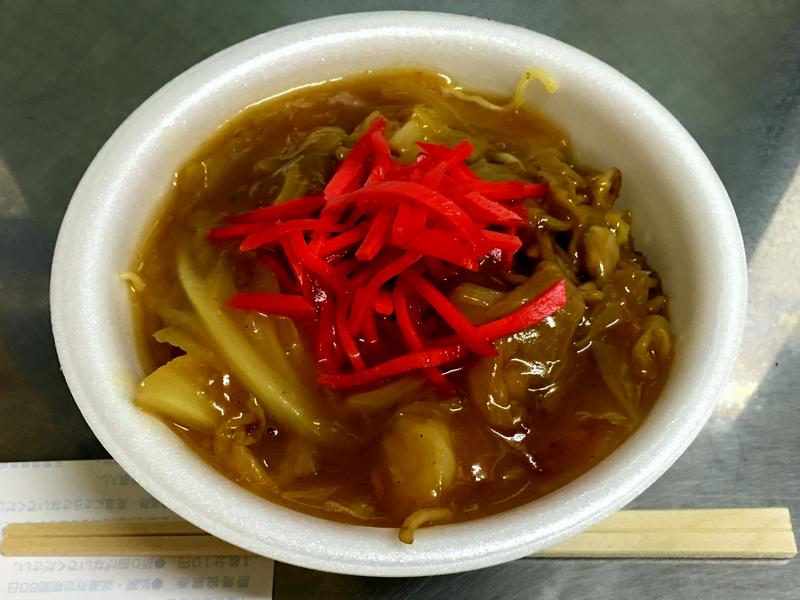で、今回のまた、いただいてしまうとお腹が膨れて他の競馬場グルメを堪能できなくなってしまう危険が有るにもかかわらず、ついついいただいてしまったあんかけ焼きそば。っていうか、良い感じに酔っ払ってきた時、トロッと汁っぽく、そして味濃いめなこの品が、どうしても欲しくなってしまったというか。ちなみに、焼きそばの具はほぼキャベツで、餡の具はクタクタに煮込まれた、これまたキャベツの他モヤシなどの野菜類。あと、(更にしょっぱくなりますが)サービスの紅生姜を載せていただくと、これもまた旨いです。