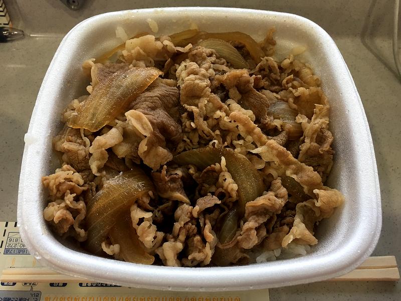 こちらは、同行者が「牛丼食べたい」と申したので購入。もっとも、ここの吉野家さんは牛丼メニューがこの1種類のみ(並盛りはない。あとはお新香と半熟玉子くらいだっかと。)ので、そのボリュームに少々やられていたようでしたが。あと、メモってくるのを忘れたので価格はうろ覚え。でも、街中の吉野家で大盛りをいただく(550円)よりは安かったと思うのですが。