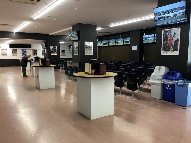 入口から入ったところが一般観戦エリア。椅子があるのが良いですね。で、写真を撮ったのが開場直後で、この日発売される最初のレースまで1時間以上有ったためかお客さんはほとんど居ませんが、午後には結構な混雑具合でした。また、元々ここにあった小女子7-8という飲食売店が規模を小さくしながらも残っていたのですが、残念ながらこの日はお休み。名物のマグロ丼、食べたかったなぁ。