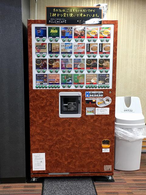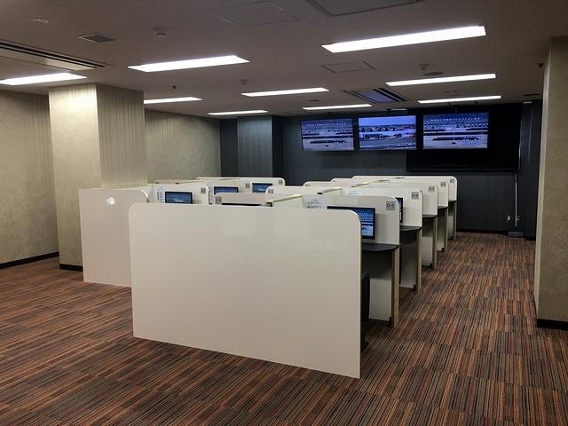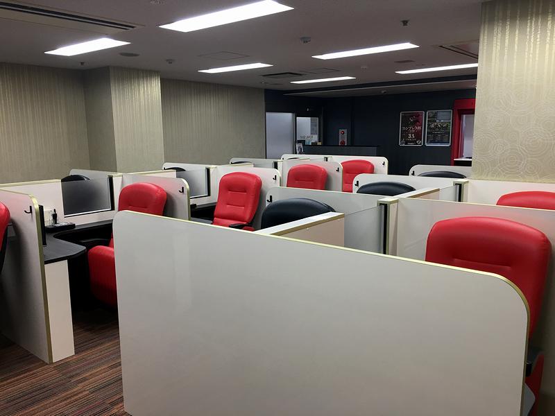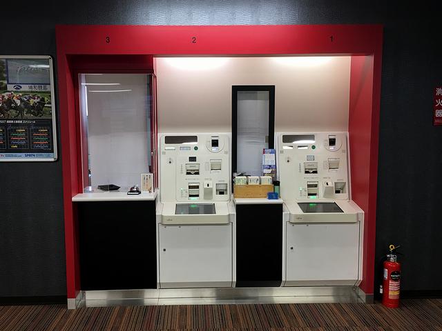で、これがロイヤル席。列ごとに黒と赤に染められたシートが並んでお洒落?で、席ごとにモニターはあるのですが、その他前方には、3場発売に対応した3つのモニターがあり、後方には2台の自動発売・払戻機と有人の払戻窓口も。また、無料のソフトドリンクは、カップ式の自動販売機でした。