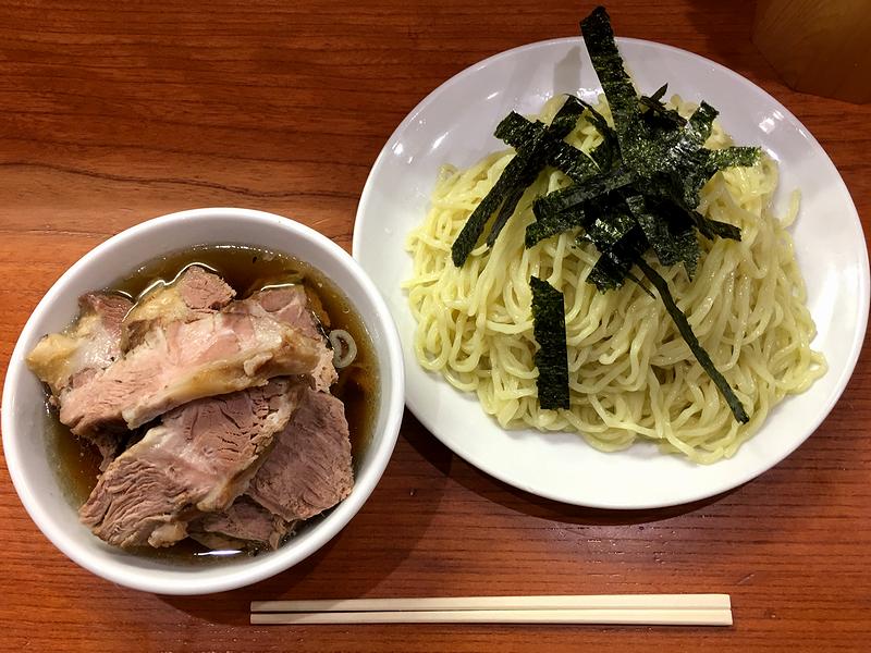 それがこのチャーシューざる。ちょっとだけ待って登場したそれは、一目見て、笑っちゃう程大量のチャーシューに驚かされます。で、まずは、こちらも山盛りの麺だけちょこっと啜ってみたところ、流水で締められたそれは、ツルシコな食感で喉越しも良いですね。そして、そのままでは無理なので、一部チャーシューを麺の上に移動させてからはつけ汁に浸けていただいたところ、つけ汁はガラ?出汁がベースでしょうか?そこに醤油のエッジとしっかりとした塩気、そして旨味も効かされているように感じ、更には七味唐辛子?がアクセントに。甘味や酸味は加えられていないようなのですが、途中からお酢を投入したところ、良い味変になりました。また前述のとおり大量のチャーシューは、ホロ柔らかい食感で、味付けは濃くなく薄すぎず、お陰でいくらでも食べられる気が(あくまでも「気がする」だけです。)するのですが、コショウを掛けるとまた良い感じに。あと、逆にメンマは味が濃く、どこか懐かしい風味がしました。