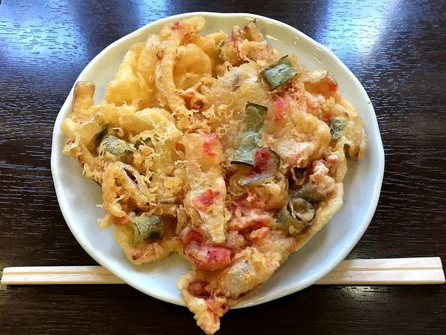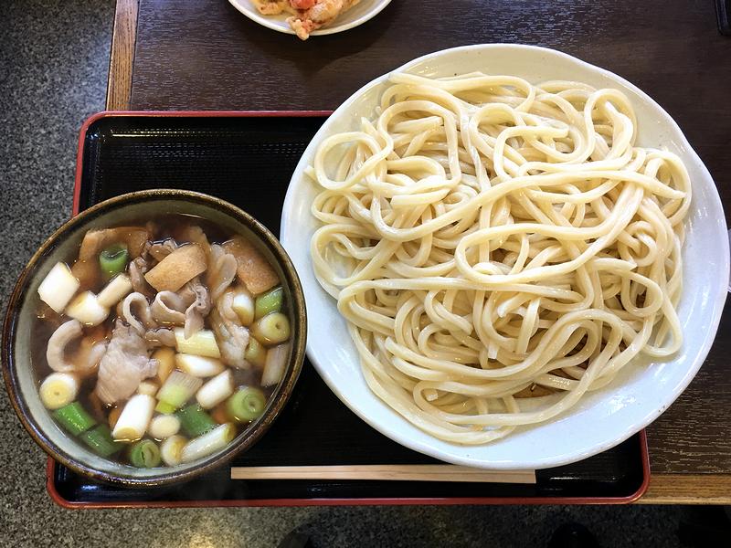それでいただいたのが、当地のうどんといえばコレというか、お品書きにも赤字で「☆当店一番人気」こちらの品。ですが、並(680円)、中(880円)、大の中から大を選んだのはやってしまいした。写真だと伝わりづらいのですが、つけ汁が入った器のサイズが、通常かけうどんなどに使うサイズのもので、うどんの入ったお皿は直径が優に30cmを超えているという。なので覚悟を決めてまず、ウドンだけをそのままいただいてみたところ、茹でたてを冷水で締めてすぐに提供されたような強い歯応えとコシが。またウドン自体が結構長めで、1本で丁度口いっぱいになりますね。そしてつけ汁は、具に豚肉、ネギ、油揚げ、味付けは濃い口醤油という、肉汁うどんの王道という構成。出汁感はそこそこなれど、具材の旨味と醤油っ気で食べさせる感じで、太めのうどん共々、気取らない感じが何とも良いです。それと、一緒に頼んだかき揚げも、結構サイズが大きかったのですが、揚げ置きされたもので、その分食感はソフトめ。タネはタマネギなど野菜がメインでしたが、桜エビがアクセントに。つゆとの馴染みは良く、今回に限っては大量のうどんをいただく際の味変アイテムとして活躍しました。