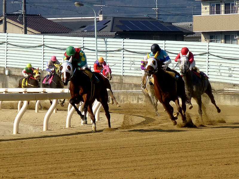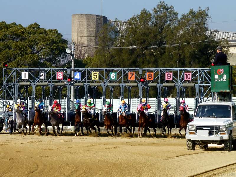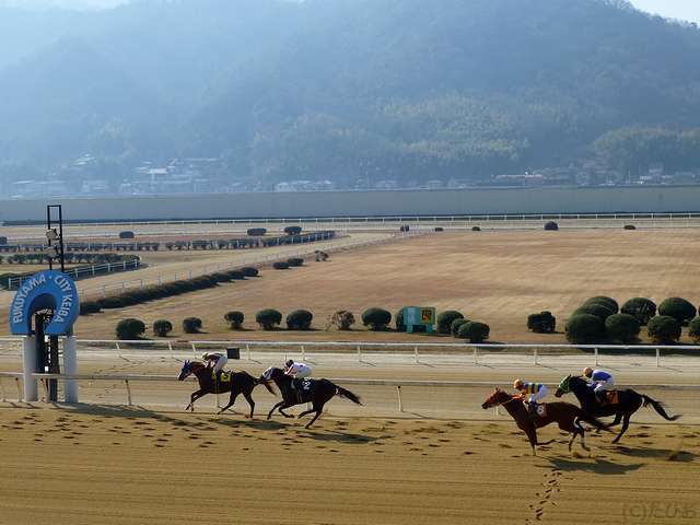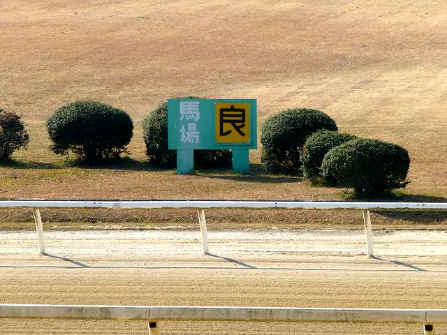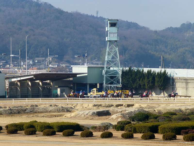 福山競馬場のコースは、前述のとおり、現在日本にある競馬場のなかで最短となる1周1,000mの平坦なダートコース。レース距離設定は800m、1,130m、1,250m、1,600m、1,800m、2,250m、2,600mが可能。(ちなみにお伺いしたこの日は1,250mと1,600mのレースのみが組まれていました。)また幅員は18~25mで、フルゲートは10頭。最後の直線は300で、うち4角からゴール板までは220mとなっています。と、スペック的にはそんなところなのですが、実際にコースを見てみるとかなりコンパクトというか小回りというか。また、地方競馬場の競馬場は概してコースとの距離が近いのですが、ここは特にそう感じたというか、かなりの臨場感でした。