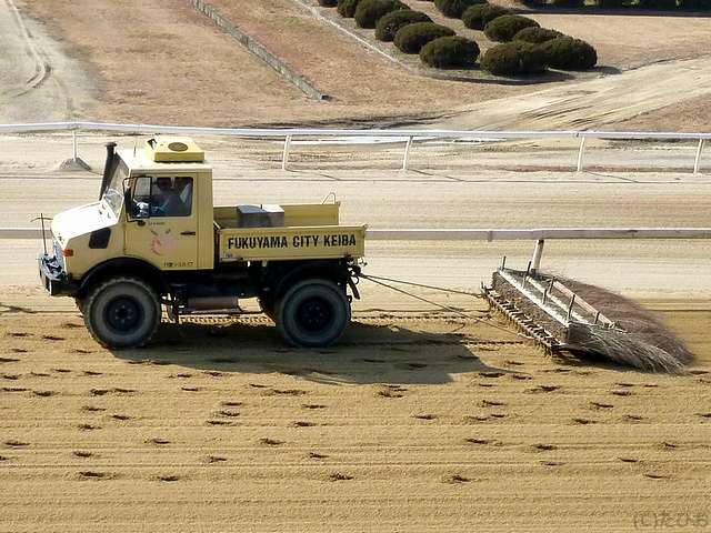 あとコース周りの施設などについてもいくつか。まずゴール板ですが、後ろにのけぞっているような形が何とも特徴的というか。他には、馬場状態を示す看板や立派な映像装置もありました。それと表彰台ですが、コース同様コンパクトで、お客さんとの距離が近いですね。ちなみに写真は、8R終了後に行われた、この日から期間限定騎乗となる金沢競馬の青柳正義騎手と畑中信司機種の紹介セレモニーの様子です。あと、コース整備にはウニモグの他、コマツのホイールローダが使われていました。