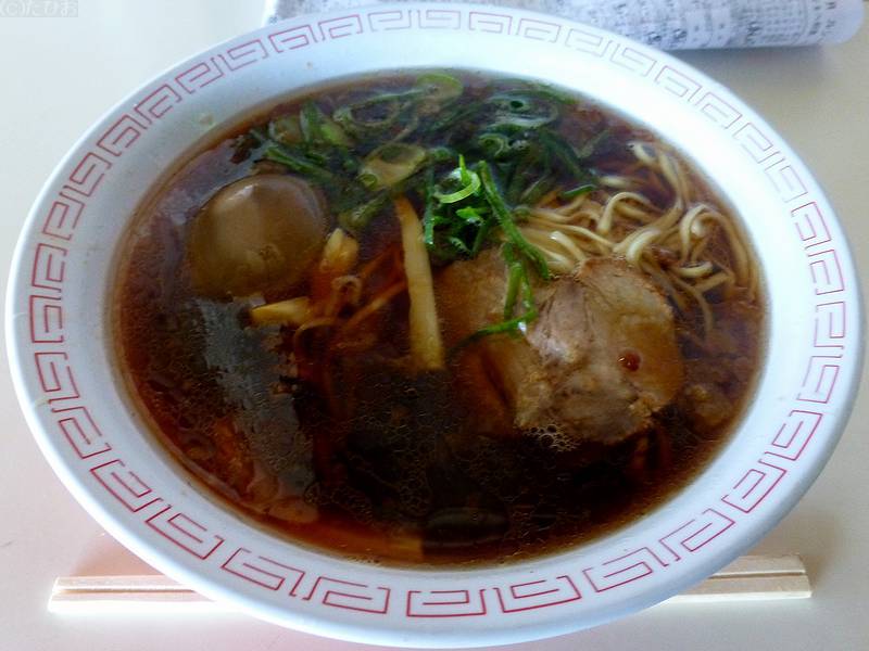 まずは有名な、スタンド2階にある『ホースショップ』の尾道ラーメン。こちらはノーマルのラーメンに+50円で煮玉子を追加した物です。で、まずは、脂が結構浮いたスープからいただくと、黒々とした見た目に反してマイルドな甘味のある醤油味に、尾道ラーメンの特徴である揚げた背脂のコクと香ばしさがマッチ。麺は平打ちの細ストレートで、ツルツルっとした食感。具のチャーシューやメンマは懐かしい感じ。そして追加の煮玉子は、固ゆでの黄身がホクホクで、ラーメン同様色は濃いですが良い塩梅。個人的に尾道ラーメンは、7、8年前に有名なお店でいただいて以来だったのですが、その時に匹敵する美味しさでした。