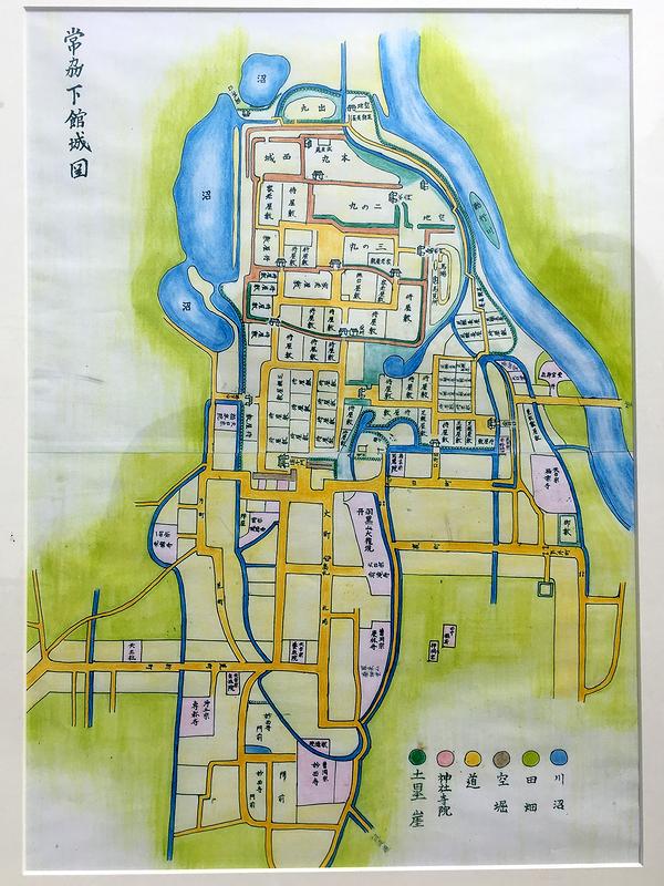 更には、「折角見に来てくれたのだから」ということで、境内の建物から「慶応3年下館城下町絵図」を出して見せてくれました。ちなみに、この絵図を元にしたと思われる案内板が境内に立っています。それにしても、慶応3年は明治に入る前年。明治のごく初期に廃城となった下館城ですが、その末期の姿を伝える大変貴重なものですね。また更に、もう1枚の絵図も出して、それらを元に色々と説明してくださり、とても有り難かったです。