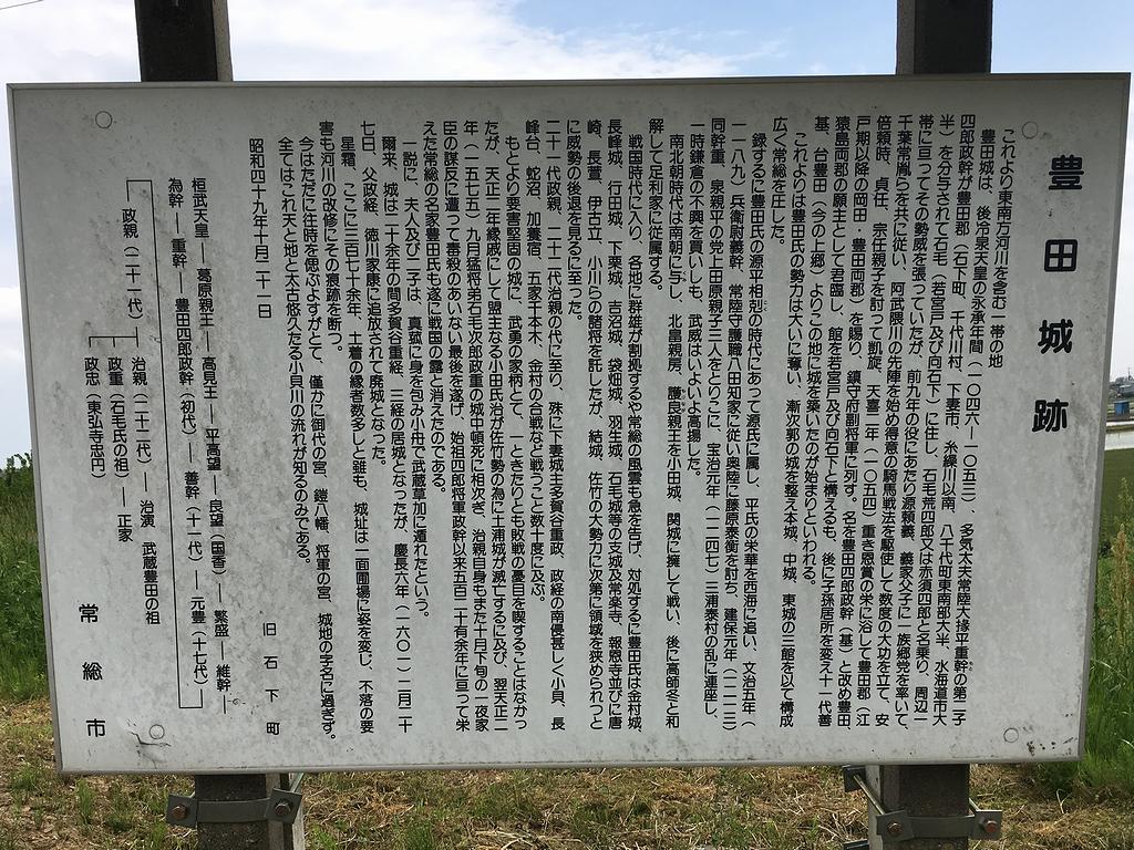 その後、小貝川の堤防上にある石碑を見に。近くには駐車場付きの小さな公園があったので、そこにクルマを停めることができました。で、河川改修とほ場整備事業によって遺構は完全に無くなってしまったとのことですが、石碑の横には、豊田城の詳細な歴史を記した案内板が、何とか頑張っているといった感じで建てられていました。