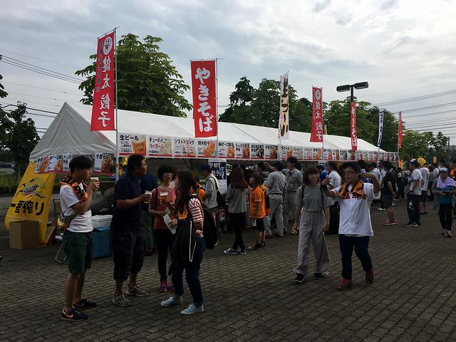 シャトルバスを降り、横断歩道を渡ると、そこはもう球場の敷地内。スタジアムの周囲には、飲食物やグッズの出店(野球の)が出ているのが見えます。