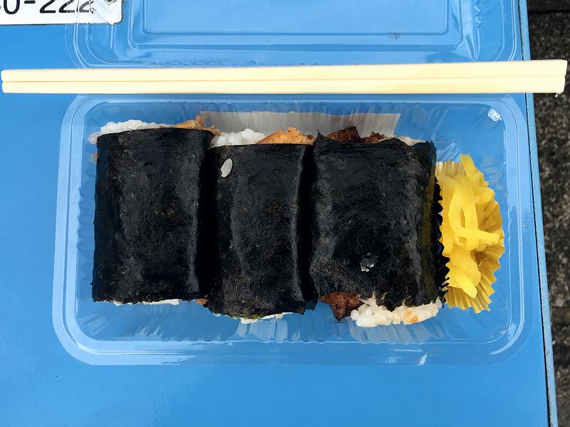 いきなりですが、これが今回いただいた中で一番印象に残った品。餃子とご飯を半ば無理矢理海苔で巻いたようなものなのですが、その相性は悪い筈が無く、更に、その間に挟まった練り梅的なものがなんとも良い仕事をしていました。