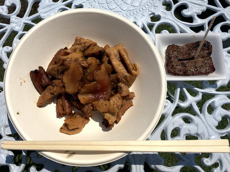 そこで朝イチに朝食代わりで購入したのがこちら。様々な部位の入った焼きたてのホルモンは、ニンニクのバシっと効いた味噌で味付けられていたですが、ホルモン自体も部位毎の味と食感の違いも楽しめ美味しゅうございました。また、おまけでくれた試食用の牛肉は最高。この時、一緒にいただいたビールを1杯だけで我慢してしまうのが勿体なかったというか。