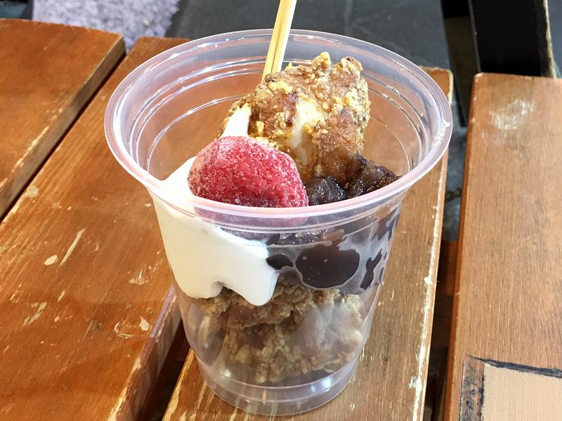 手渡されてまず、「あれ?熱くないぞ?」と思ったのですが、何でも生クリームが溶けないよう、あえてアツアツのから揚げを使っていないそう。早速、から揚げにその生クリームと小倉餡を絡めていってみたところ、から揚げの塩気と香ばしさに生クリームと小倉餡が良い感じにマッチしています。考えてみれば、肉料理では甘味の効いたソースを用いることもあるわけで、味的にみれば全くおかしくない組み合わせなんですよね。更に、添えられた冷凍イチゴがサッパリ感を加えて、全体の完成度を上げているように感じました。で、こちらのお店では、元々のから揚げにニンニクを使っていないのも、これらとの相性を良くしている要因になっていると思いますし、先述の温度や、小倉餡にも改良を加えるなどなどの工夫がされているので、名前と見た目のインパクトは凄いものの、中身はとてもちゃんとしていたというか。