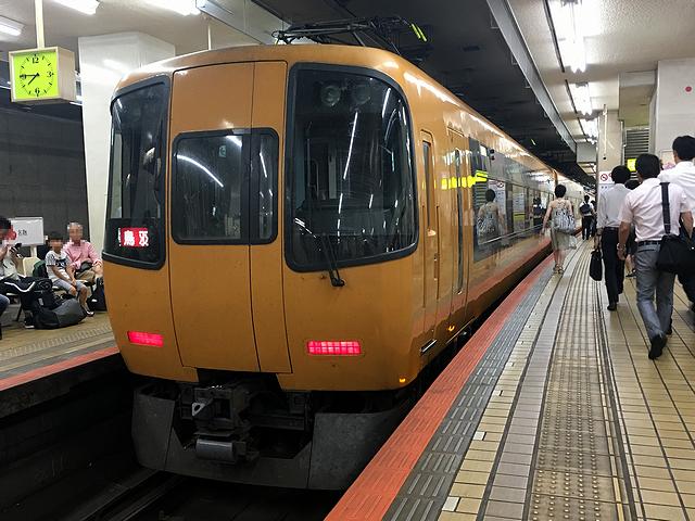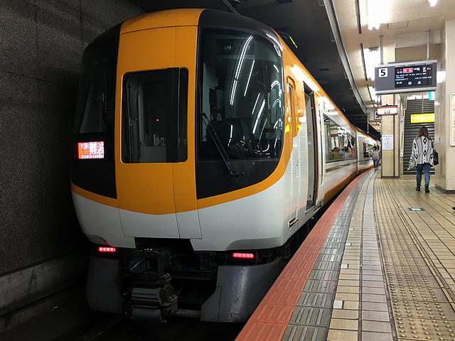 そうこうしているうち、これから乗車する5番ホームに停車していた先発の回送列車が発車したので、指定席を取った3号車の乗車位置へ移動するのですが、ビスタカーの二階建て車両は、出入り口が車体中央の1箇所となっています。で、発車時刻の10分前である8:20頃、今回乗車する大阪難波行き特急列車が、6両編成で入線してきました。ちなみに、近鉄の特急列車には一部を除き列車ごとの愛称が付いていないため、発着駅によるもの(名古屋-大阪方面のは「名阪特急」、名古屋-伊勢志摩方面のは「名伊特急」、大阪-伊勢志摩方面のは「阪伊特急」など)と、停車駅の多寡(停車駅が少ない「甲特急」、多い「乙特急」)による部内呼称があるそうなりですが、それに従うとこれから乗車する列車は、名阪乙特急となるようです。それで入線するとすぐにドアが開いたので、二階席の最後方窓側となる自席へと。