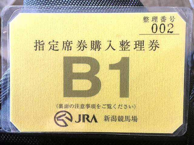 新潟競馬場には午前7時半頃到着。無料の駐車場はまだ余裕が有りました。それで、この時点で当日売りのS-1指定席(NiLS21スタンド3階)は既に整理券配布が終わっていて満席。他の席は、A-1指定席(アイビススタンド3階)に長蛇の列、B-2指定席(アイビススタンド2階)は先客数組、B-1指定席は(アイビススタンド2階)は先客1名という状態。やはりゴール板に近い方から売れるみたいですね。それと、近くの職員さんに他の席の整理券配布開始の時刻を尋ねたところ、混雑状況によって変わる(列の人数が増えたら配布)とのこと。今回はとりあえず席が確保できればどこでも良かったので、一番ゴール板から遠いB-1指定席(1席入場料込み500円)の列に並びました。その約10分後の午前7時40分過ぎ、A-1指定席の整理券が配布開始となり、その時点で満席に。列は解散となり、午前8時30分に再び集合して下さいとのこと。次はB-2指定席の列が伸び、B-1指定席も私たちの後ろに並ぶ人が出て来ました。それから約30分後の午前8時10分過ぎ、B-2指定席の整理券が配布開始。ただ、この時点で満席にはならず、列の解散もなし。そして午前8時30分、S-1指定席とA-1指定席の整理券番号確認が始まり、それが終わった頃の午前8時40分過ぎ、私達が並んでいるB-1指定席の整理券が配布開始。その後10分程で指定席は全て満席となり、午前9時、指定席発売開始。同時に入場開始となりました。