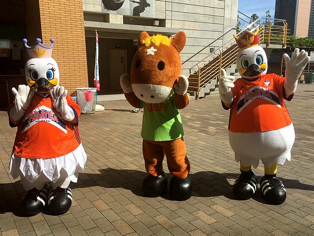 入場口から入れば、おなじみのポニーやJRAのマスコット、ターフィーの他、この日のメインレースの冠スポンサーNST(新潟総合テレビ)のゆるキャラであるナシテくんとドシテちゃん、この日のメインレースプレゼンター及び選手トークショーが行われるアルビレックス新潟のマスコットであるアルビくんとスワンちゃんのお出迎えが。