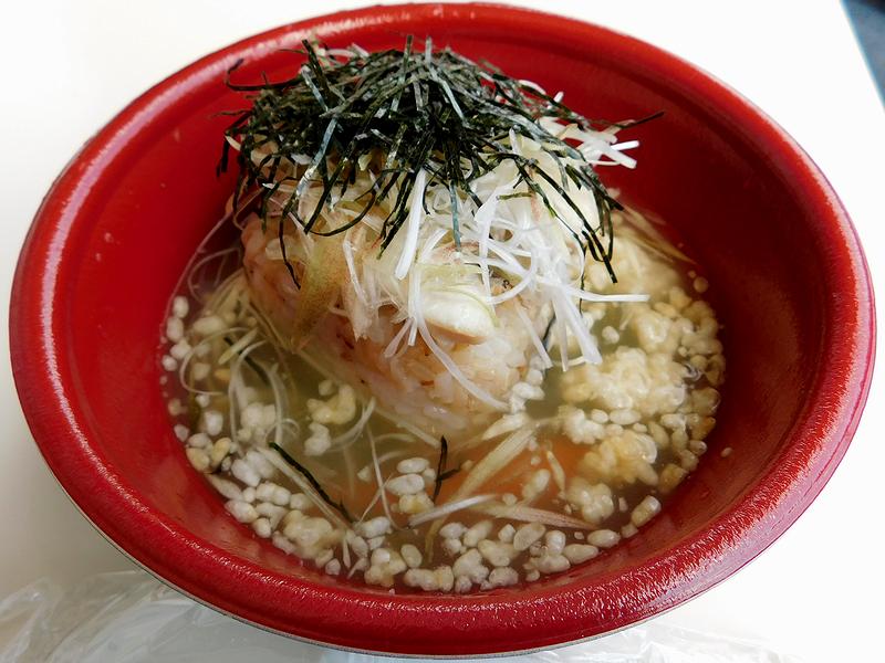 まずは、この日の第9レースに組まれていた村上特別から、新潟県村上市の越後村上物産会。その中からこちらの品をチョイスしてみました。で、焼きおにぎりの上に火を通した鯛の身を載せ、冷たいだし茶漬けに仕立てたような一品で、ご飯のお焦げっぽい風味と食感が良いですね。また薬味の(結構な量の)ワサビ、白ネギ、ミョウガ、海苔、天かすが入り、具のニンジン(ミニサイズ)と枝豆もそれぞれに良い仕事をしているのですが、何よりもだし汁が旨かった!軽く飲んだ後には最高の一品でした。