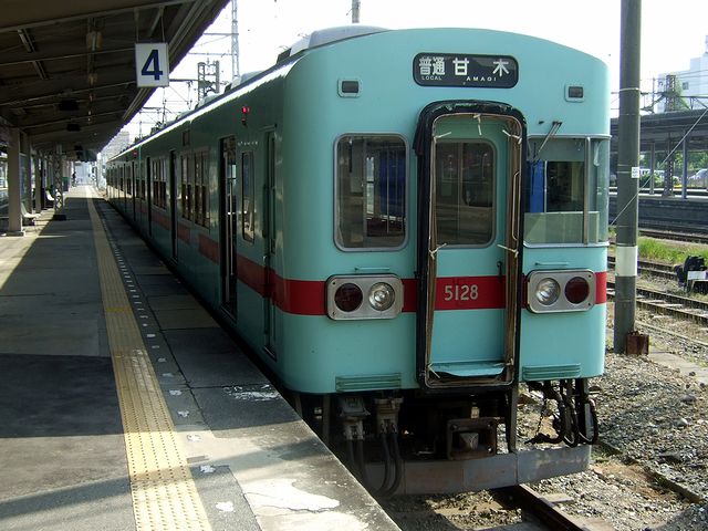 先の特急列車で西鉄天神大牟田線を走破したので、今度は途中の支線に寄りつつ引き返す事にして、まずは甘木行きの普通列車に乗車。で、この列車に使われている車両が、西鉄5000形電車の3両編成。昭和50年デビュー(乗車した車両は昭和58年製造でした)の通勤型車両で、総数136両と西鉄の電車では一大勢力を誇るのですが、この形式とこの次に製造された6000,6050形という形式に採用された運転席側だけパノラミックウインドウという個性的な正面が、個人的にはいかにも西鉄の通勤型車両という感じがします。その車両に1両あたり1人いるかいないかの乗客を乗せ発車。車内放送によると、この列車の運転手と車掌は先程の特急と同じ人で途中の西鉄柳川駅までの乗務となるそうで、また、その柳川では車両取り替えというものがあり、要は別の列車に乗り換えが必要とのこと。車両が変わる(しかも、後で入手した西鉄の時刻表を見ても別の列車番号が振ってある)のだから別の列車として走らせても良さそうな気もしますが、列車の先頭部や側面にある行き先表示はしっかりと「甘木」になっていて、駅の案内も「甘木行き」となっていたような気がします。