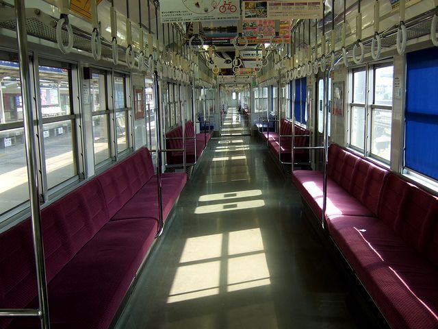 この303系も、確か乗るの初めてかもしれません。それにしても、ドアの所に貼ってある「床に座らないでください」というステッカーが、何とも。