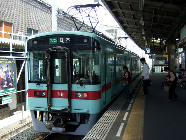 西鉄久留米駅からは、支線の甘木線直通となる甘木行き普通列車に乗車。車両は先程の7050形と一見同じに見えるのですが、実はドアの数が7050形の片側3扉に対して片側4扉と違う7000形という形式の2両です。こちらも先程の列車同様ワンマン運転なのですが、片側4扉のうち中間の2扉は閉め切りとなっていました。それにしても、先程乗った5000形でも思ったのですが、西鉄の車両って、車体の幅が狭いように感じます。
