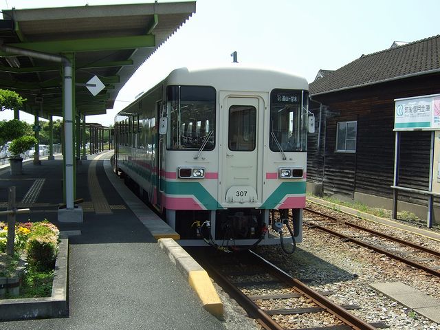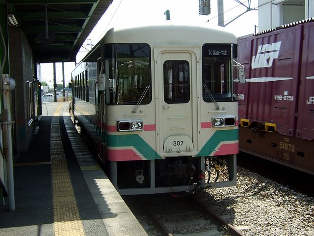 乗車券を購入してホームへ行くと、既に基山行きの1両編成のディーゼルカーが停車していました。その車両は、富士重工業(現在は新潟トランシスに事業譲渡とのこと)の第三セクター鉄道向け標準設計車両である300という形式で、307号車はその最終増備車らしいです。