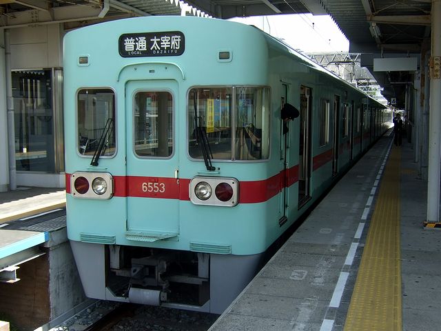 西鉄二日市駅では、2分で接続する西鉄二日市駅始発の列車にも乗ることが出来たのですが、寝起きでボーっとした頭は、何故か1本遅らせて西鉄福岡(天神)から直通列車を選択。待つこと暫しで到着したその列車は、6050形通勤形電車の4両編成でした。ちなみに6050形というのは、平成7年にデビューした西鉄初のVVVFインバータ制御車だそうです。その車両に、立ち客がちらほらと出るくらいの乗客を乗せ、西鉄二日市駅を発車。太宰府線唯一の途中駅である西鉄五条駅で3割くらいの乗客を降ろし対向列車と「離合」。そこを発車すると、ほどなくして終点の太宰府駅に到着しました。