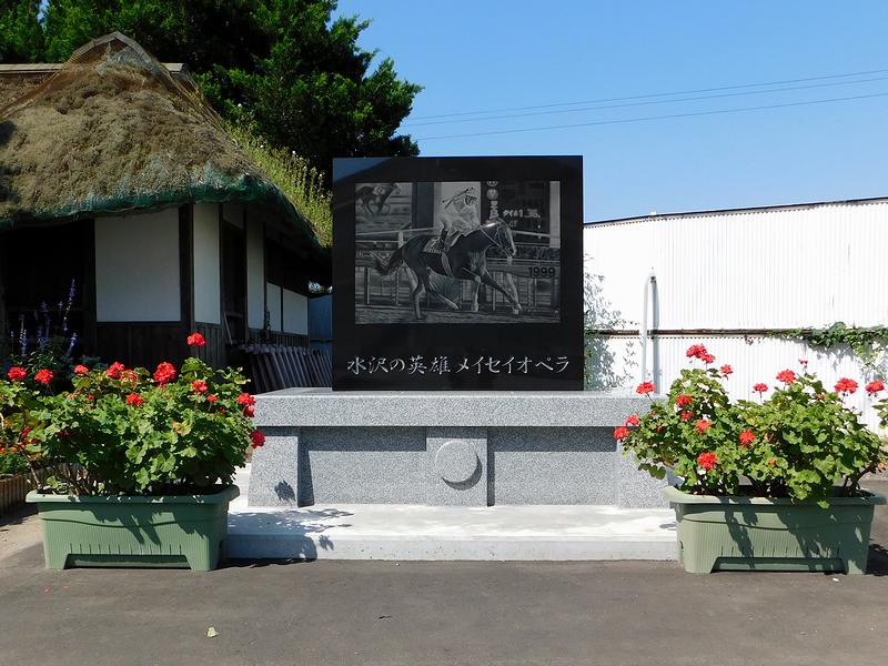開門して真っ先に向かったのが、前述のメイセイオペラ記念碑。宝(トレジャー)神社の隣にありました。で、メインの石碑に黒御影石、台座は白御影石を使った、サイズ的にも大変立派な碑で、表面は「水沢の英雄 メイセイオペラ」の文字と共に、1999年のフェブラリーステークスを優勝した時の写真を職人さんが彫り込んだもの。暖かみのある何とも味わい深い仕上がりになっています。このようなメイセイオペラ号に思いを馳せる場所作っていただき、いちファンとしてとても嬉しく思うと共に、記念碑建立に携わった関係者の皆様には、感謝しかありません。本当に、ありがとうございます。